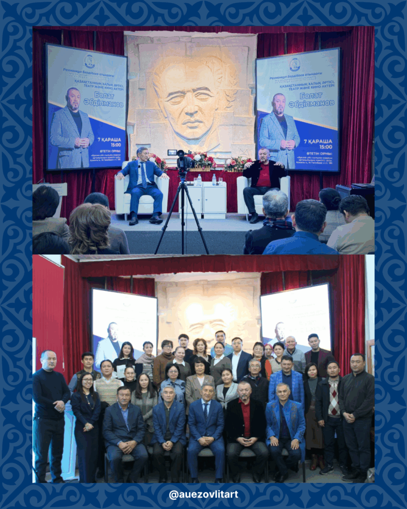 М.О. Әуезов атындағы Әдебиет және өнер институтының ұйымдастыруымен 7 қараша күні Рахманқұл Бердібай атындағы Халық университетінің кезекті дәрісі аясында Қазақстанның Халық әртісі, «Құрмет», Парасат» ордендерінің иегері, театр және кино актері Болат Мәзімбайұлы Әбділмановпен кездесу өтті.