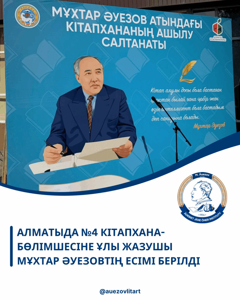 2025 жылдың 15 қазанында Алматы қаласы Орталықтандырылған кітапхана жүйесінің №4 бөлімшесіне ұлы жазушы Мұхтар Омарханұлы Әуезовтің есімінің берілуіне арналған салтанатты іс-шара өтті. Шараның мақсаты – ұлт әдебиетінің классигі Мұхтар Әуезовтің шығармашылық және қоғамдық мұрасын кеңінен насихаттау, кітапхананы мәдени-ағартушылық орталық ретінде қалыптастыру, сондай-ақ әдебиет пен өнер саласындағы ғылыми-зерттеу мекемелері мен қоғамдық ұйымдар арасындағы шығармашылық ынтымақтастықты дамыту. Бұл бастама ұлы жазушының рухани мұрасын ұлықтап, жас ұрпақтың ұлттық сана-сезімін, әдеби талғамын қалыптастыруға бағытталды.