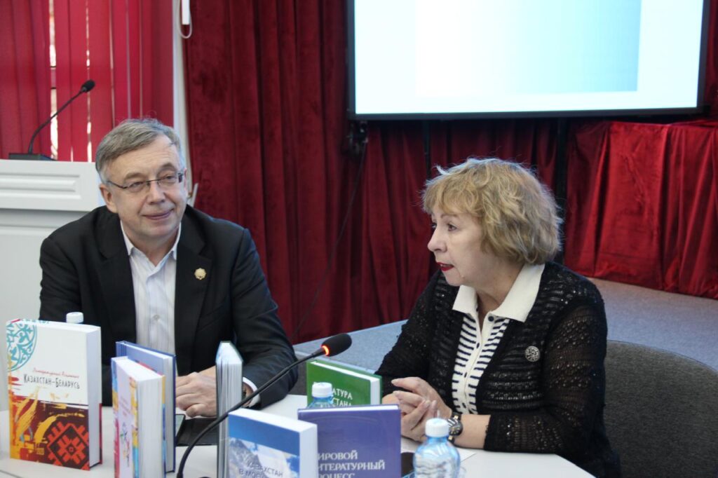 Модератор мероприятия Светлана Ананьева познакомила присутствующих с новейшими научными изданиями Института, в которых белорусская тематика является одной из основных. Это «Мировой литературный процесс ХХI века», «Культура в глобальном мире», «Казахстан в моей судьбе», «Казахская литература в международных контекстах» и другие. В первом литературном альманахе «Казахстан – Беларусь» впервые представлен литературоведческий раздел, авторами статей которого выступили Кенжехан Матыжанов, Мурат Ауэзов, Алесь Карлюкевич, Нурдаулет Акыш, Иван Саверченко, Диар Кунаев, Любовь Шашкова, Альмира Калиева, Светлана Ананьева, Ертай Султан, Аклима Омарова, Айнур Казтуганова и другие.